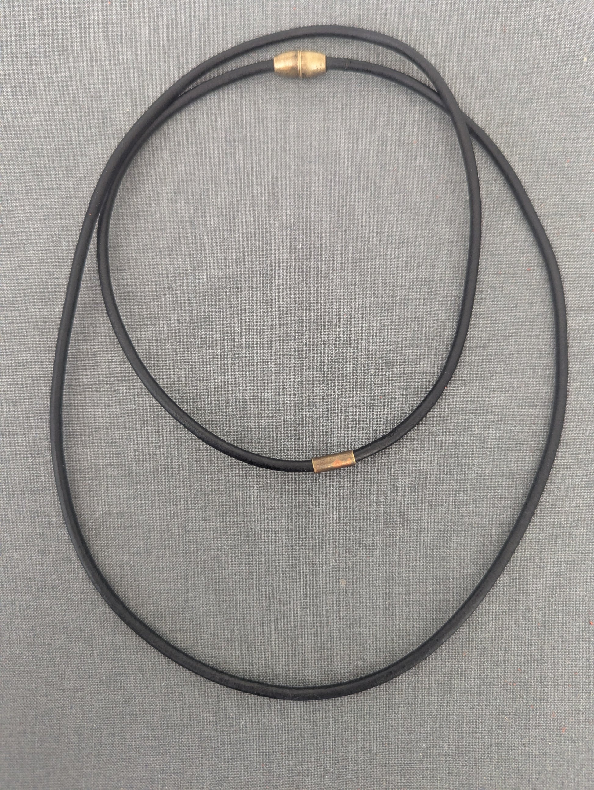 Taillé dans 80cm de cuir pleine fleur noir profond, le premier tour repose au ras de cou ; le second s'abandonne un peu plus bas, dessinant une ligne souple à la base des clavicules.